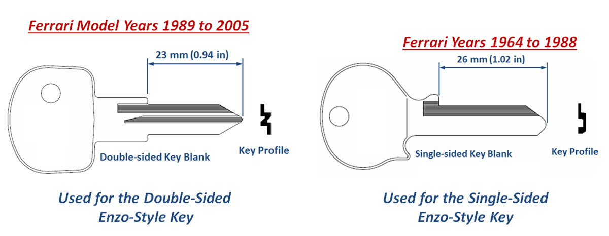 Ferrari cut over from single-sided keys to double-sided keys in 1989. Generally, models that started in 1989 use the double-sided keys and car models that ended in 1988 use single-sided keys. During the transition year, it is not certain which key may have been utilized. See the information immediately below for more information.